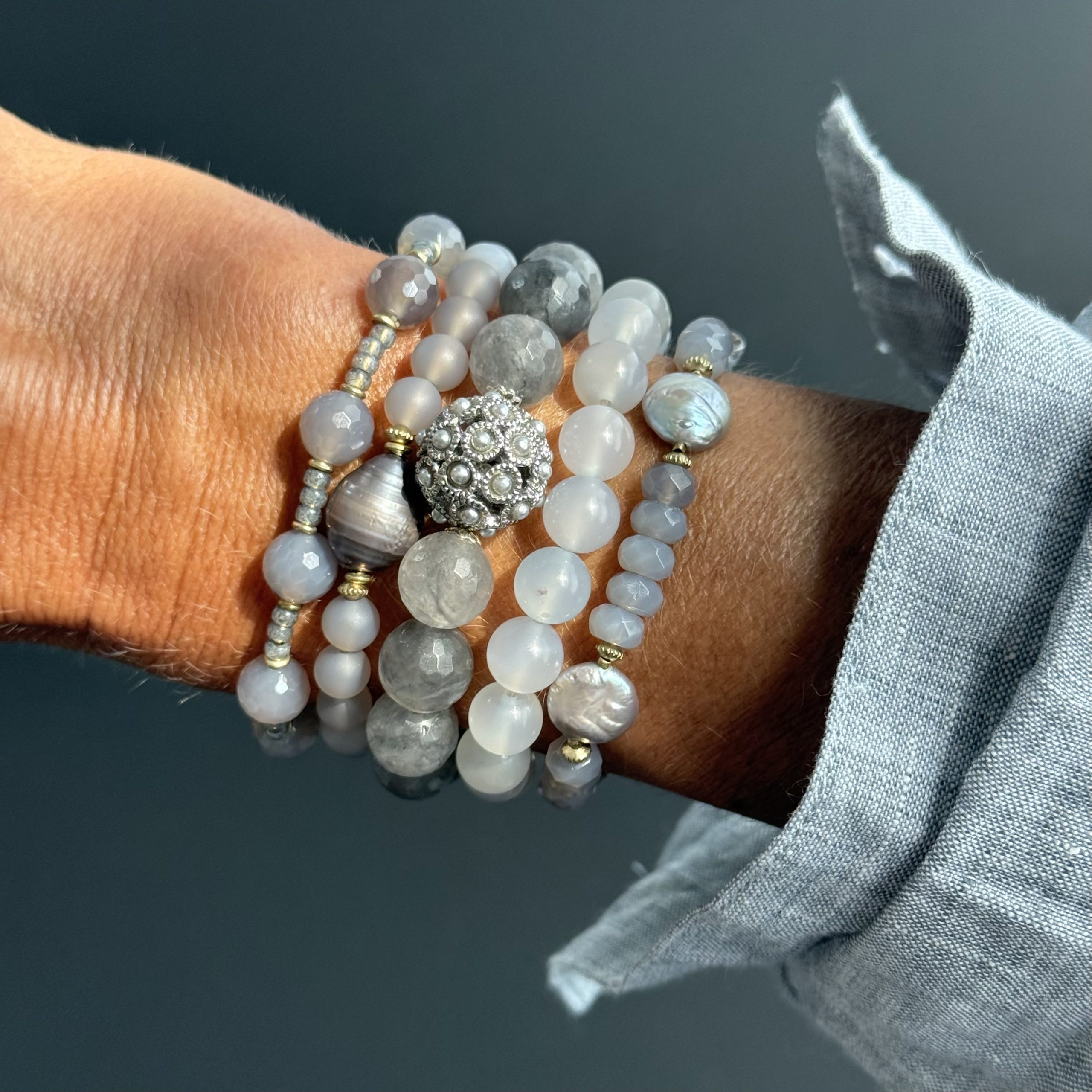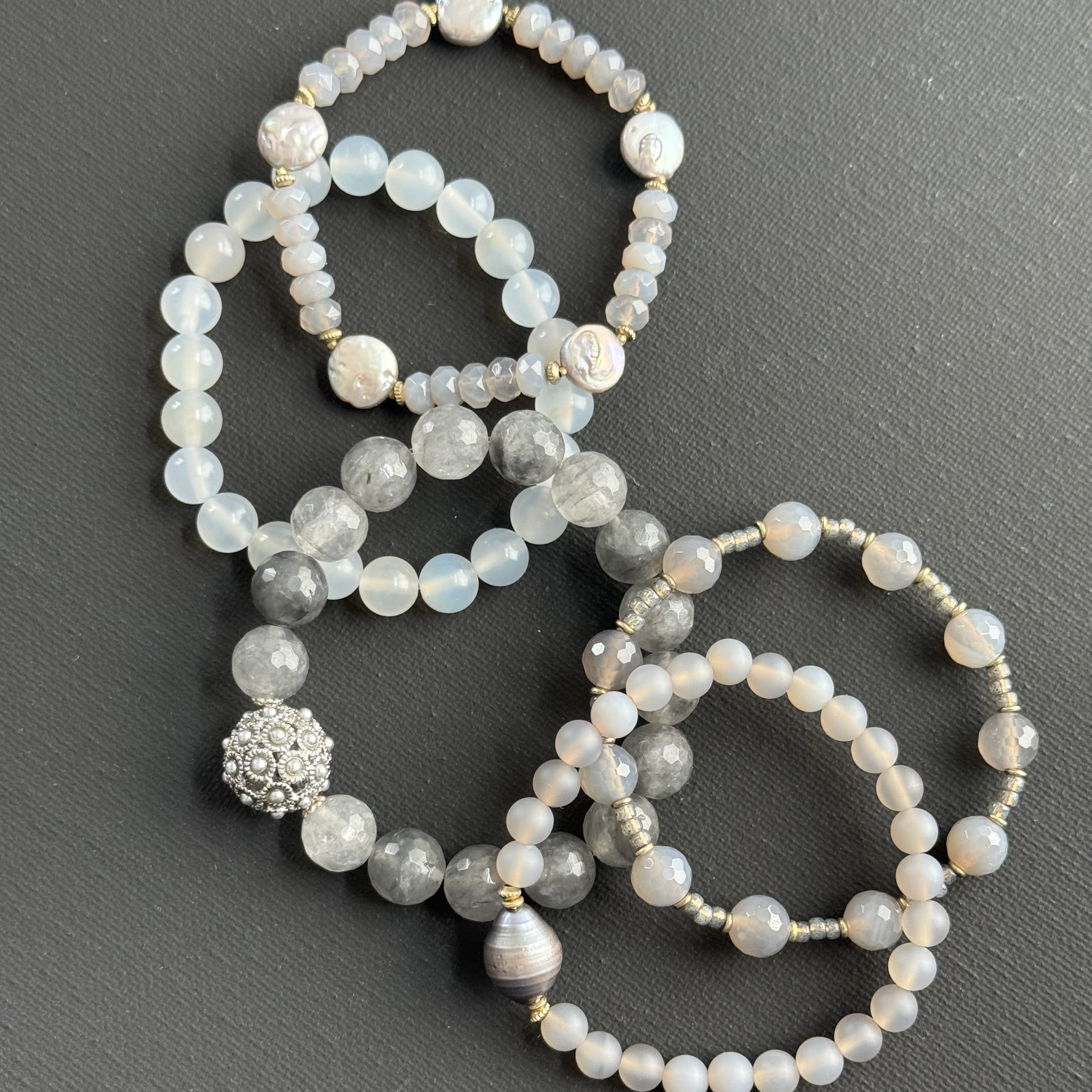 Silvery gray skies featuring a cloudy mix of Chalcedony, Quartz, and Pearl.