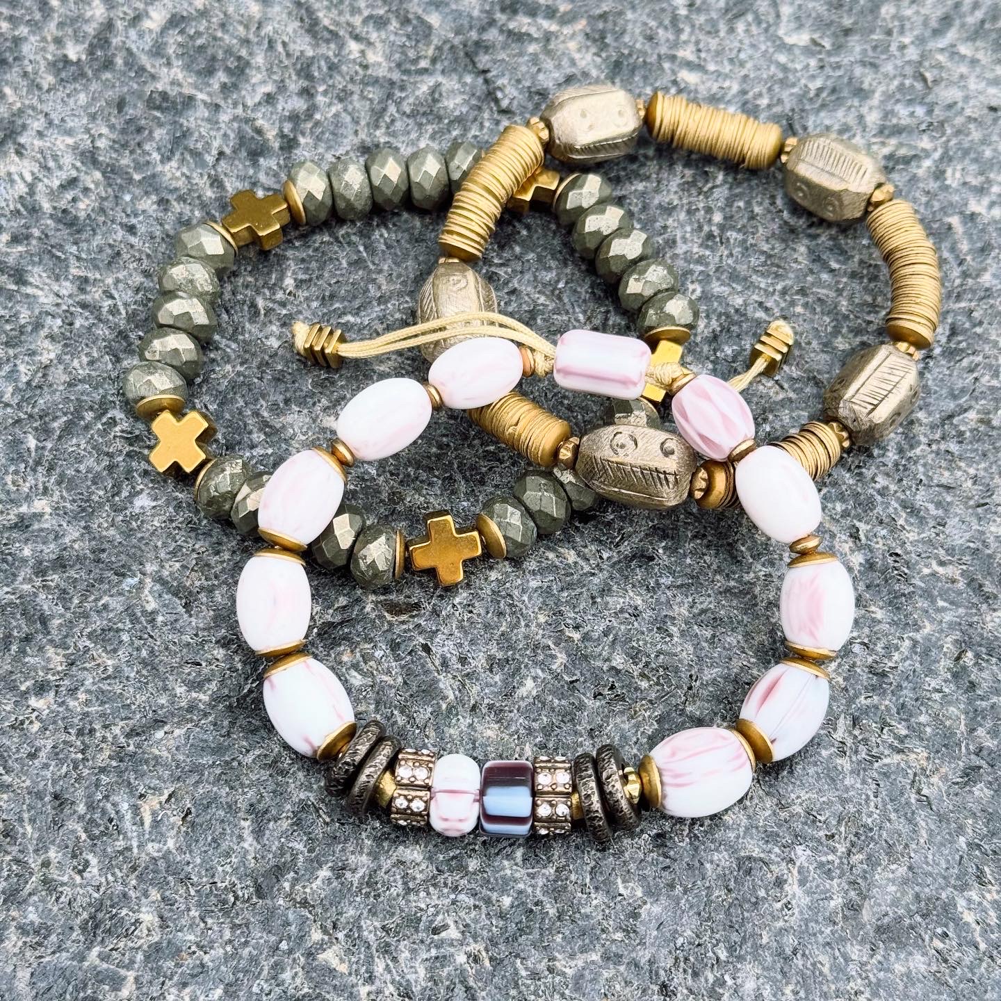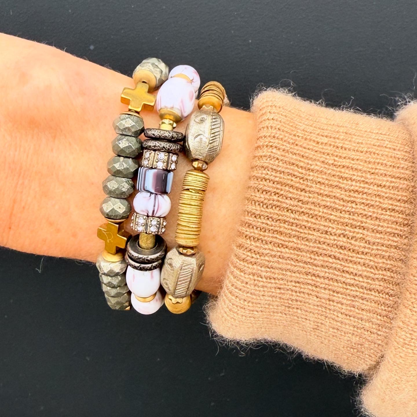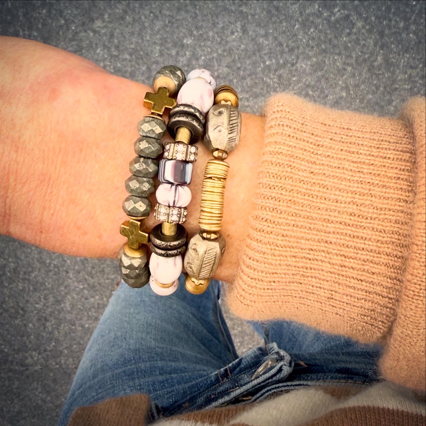 A boho luxe short stack of mixed metals, featuring Pyrite and Hematite to empower you with self-confidence and passion, sparking a call to action and excitement as you pursue what sets your soul on fire!