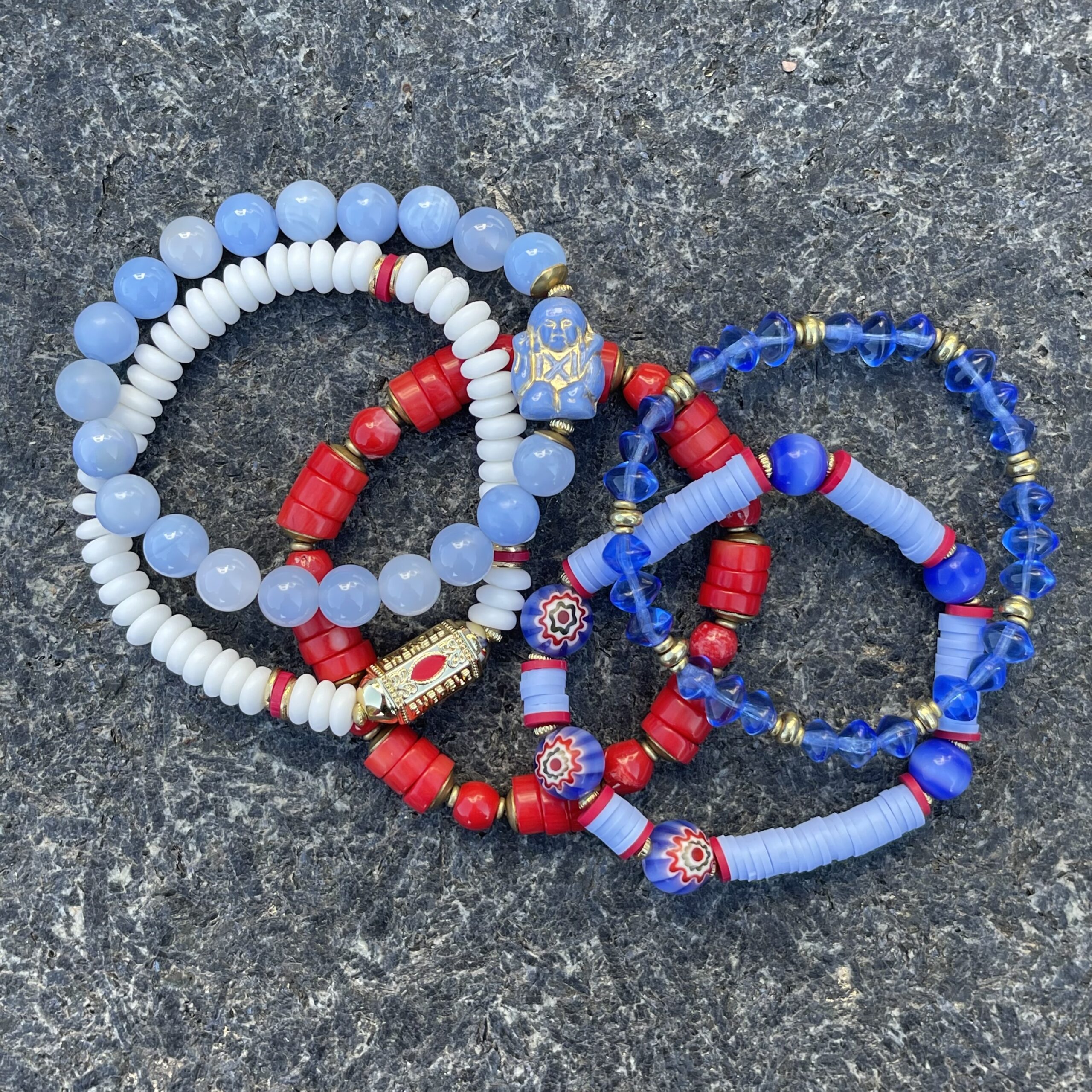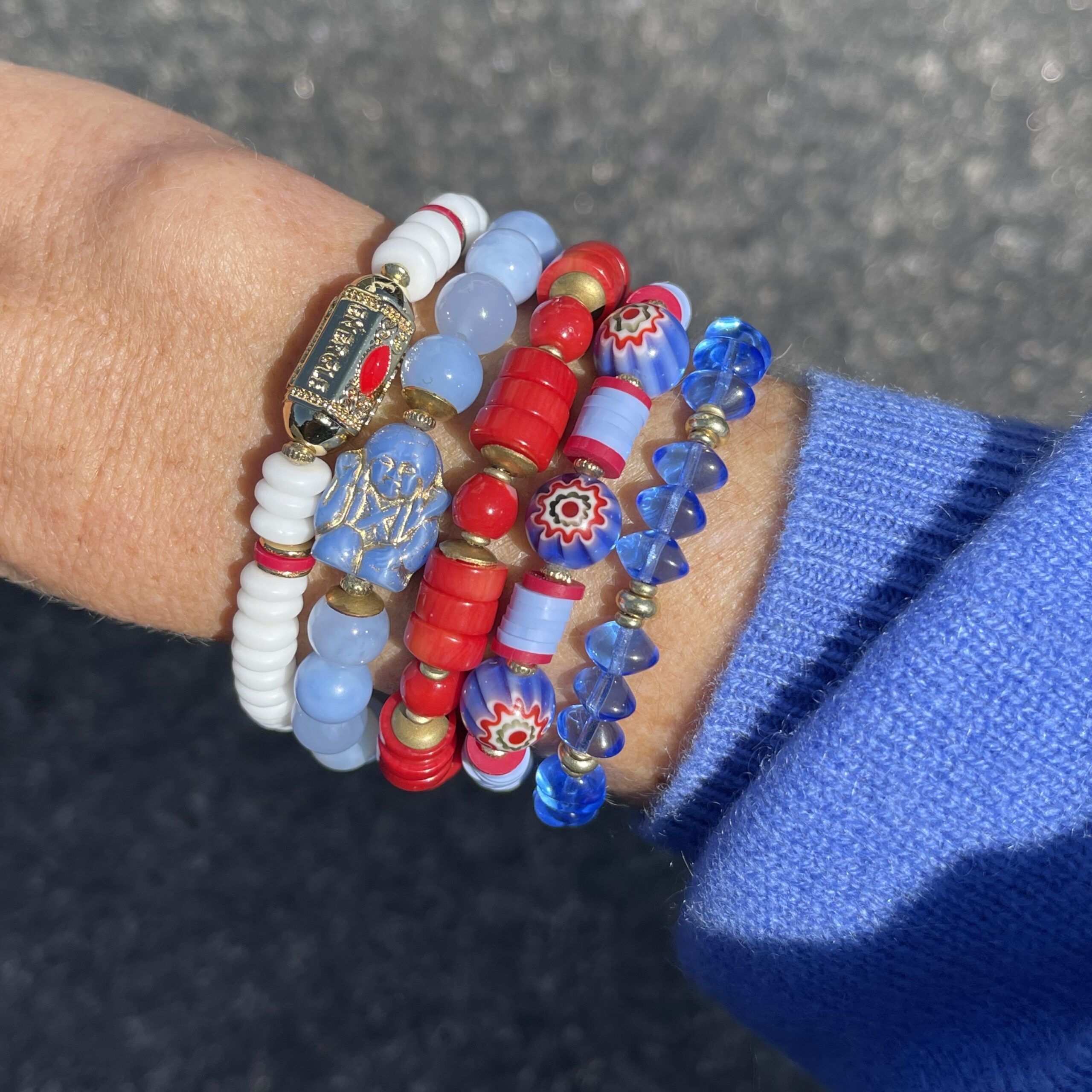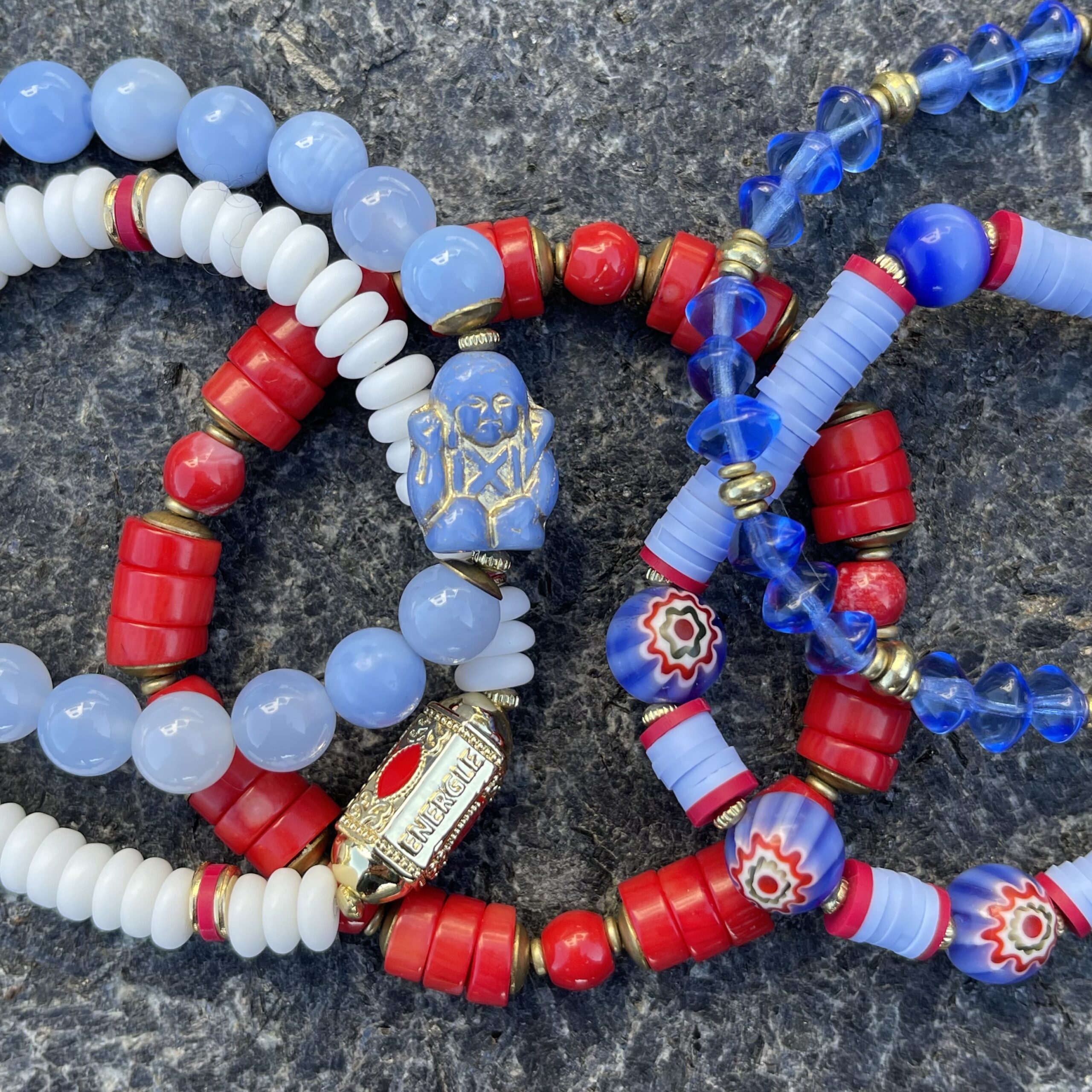A boho mix of periwinkle, red and white to invite calm and acceptance, helping you go with the flow and surrender to the rhythm of life. This stack features Red Coral, Blue Lace Agate, and white glass with a gold and red ENERGIE focal bead. From Potomac Beads…the fabulous Buddha along with vibrant blue glass.