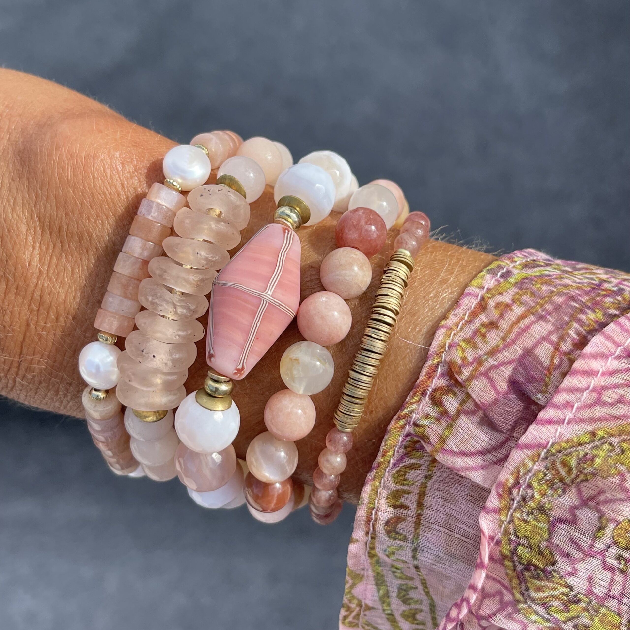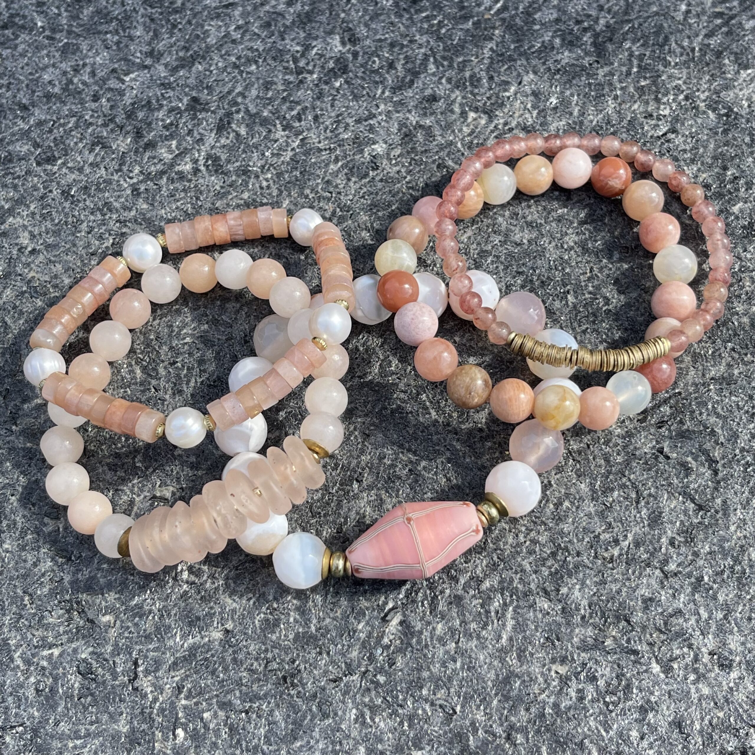 A decidedly soft and feminine stack to inspire and empower you to show up for yourself in a way that no one else can. Featuring Moonstone, Recycled Glass, Pearl, Peach Aventurine, Agate, and Strawberry Quartz.