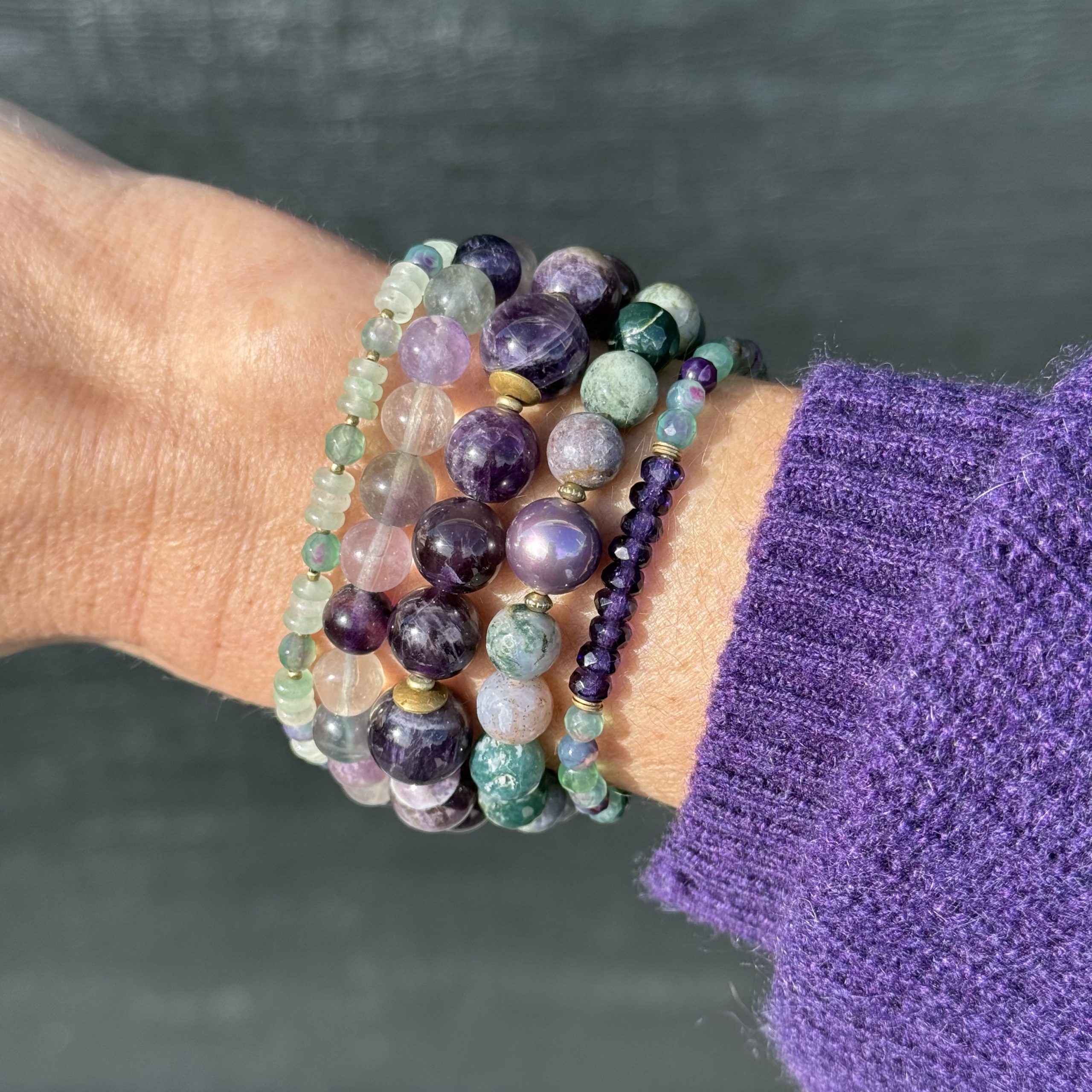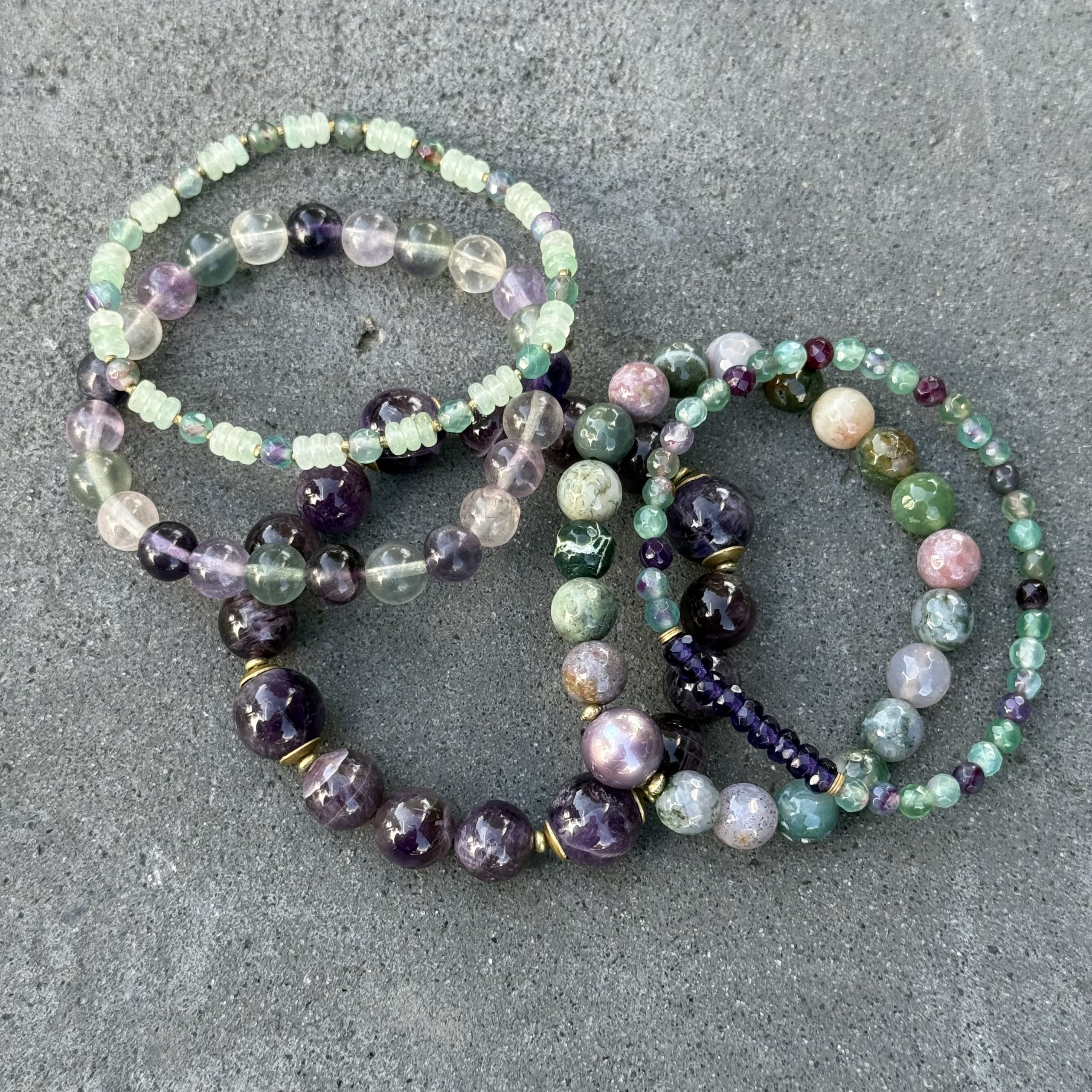 A bold boho stack featuring Fluorite, Quartz, Fancy Jasper, Amethyst, and Green Aventurine to amplify feelings of well-being, inspiring presence and enjoyment in moments both big and small.
