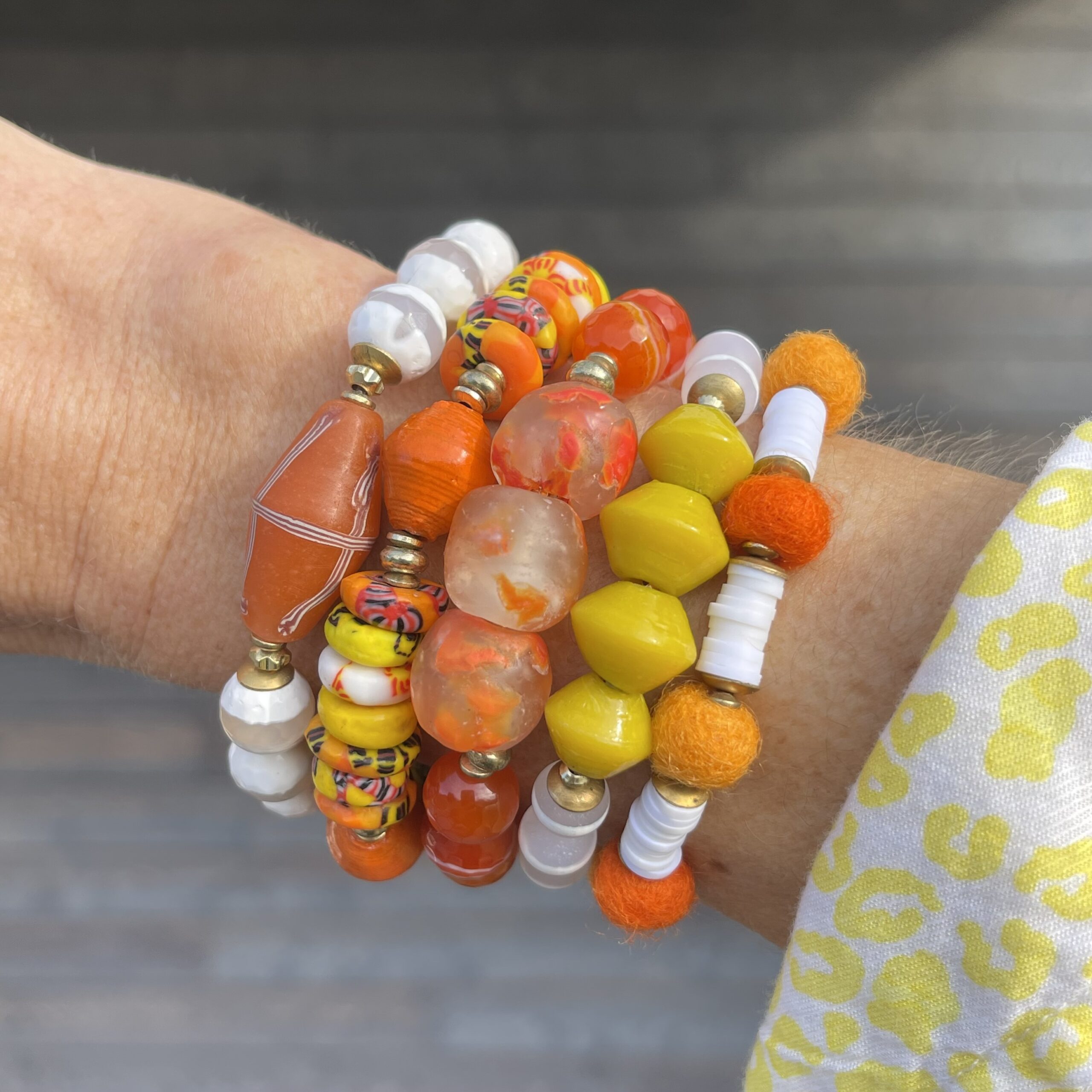 Interrupting this blast of frigid winter weather with a refreshing burst of citrus! When I was little, every winter my grandmother would send us a box of perfect oranges from Florida. Inspired by that juicy treat, this vibrant boho stack is designed to brighten gray days and encourage warm thoughts.